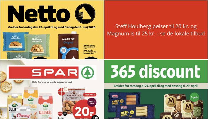 Hos Netto kan du få Magnum is i forskellige varianter i 3-pak til en pris af 25 kr. pr. pakke. Dette tilbud er gyldigt fra lørdag den 25. april til fredag den 1. maj.